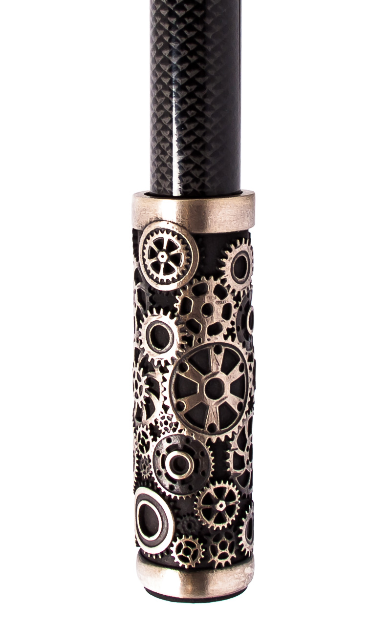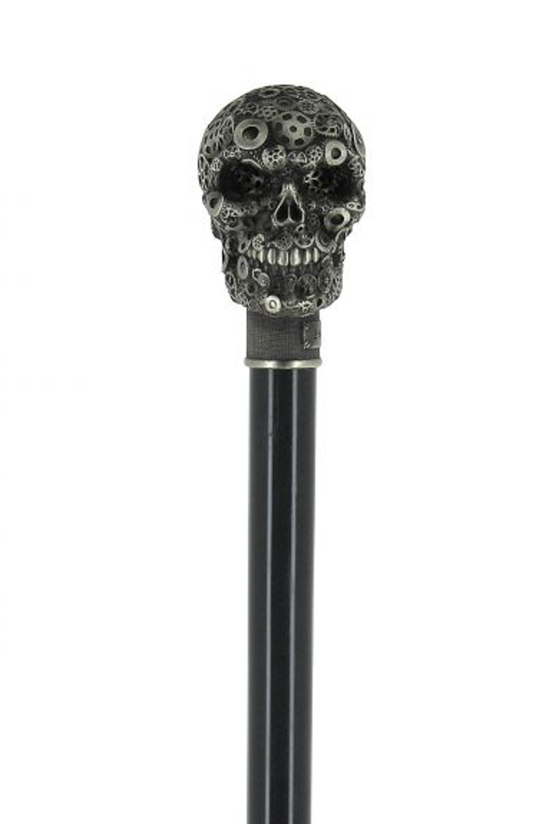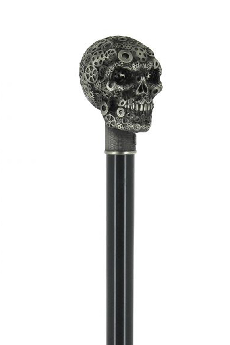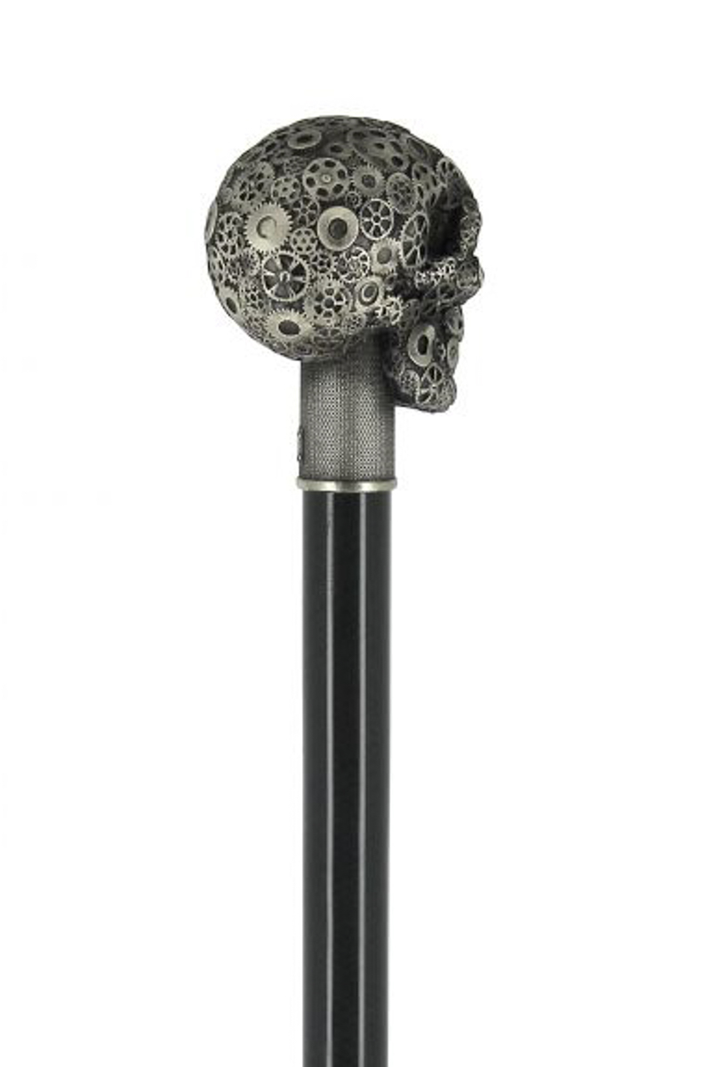A sétabot markolata is különleges. Fehér bronzból készült koponya forma amelyet fogaskerek díszítenek.