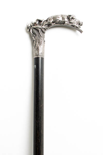 "Vaddisznót hajtó vadászkutya" jelenetet mintázó ezüstözött sétabot ébenfa szárral, botgumival.
